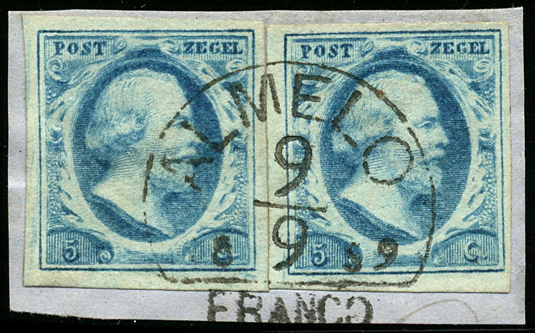 ALMELO C (EY.75) op 5 cent. Twee prachtex. op briefstukje met centrale afst.