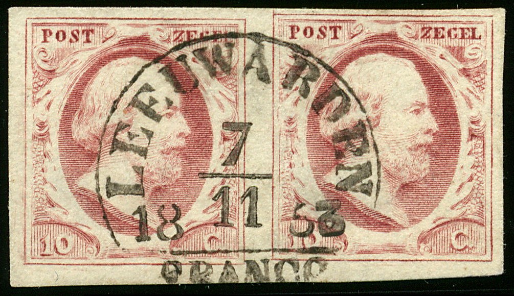 LEEUWARDEN B klein (EY.75) op 10 cent. Prachtpaar (rand boven hoger staande rechterzegel iets smal) met mooie, centrale afst.