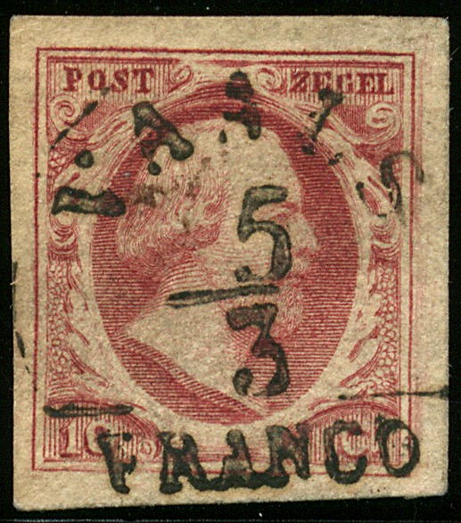 VAALS A (EY.R) op 10 cent karmijn. Vrijwel prachtex. (breed gerand doch vouwtje door bovenrand, aan vz. niet te zien) met ideale afdruk van dit op de 10 cent zeldzame stempel