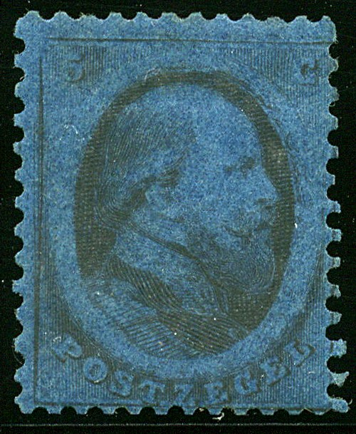 PC.25b, kleurproef van de 5 cent plaat I in zwart op donkerblauw papier, met gom, getand. Prachtex. met volle, originele gom en papierplakkerrest. Schaars. f 150