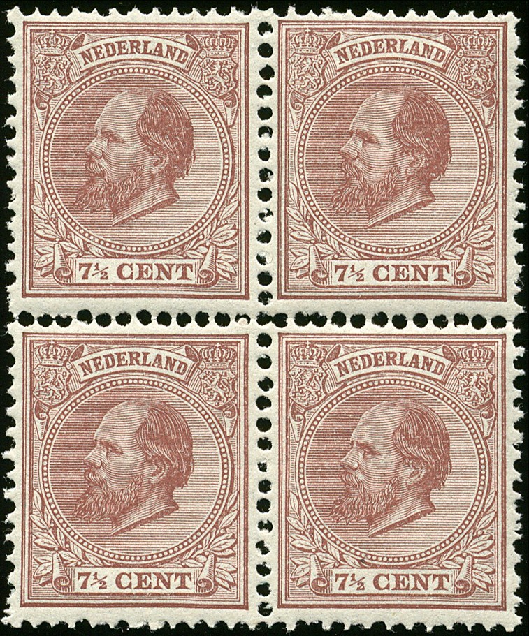 20, 7½ cent chocoladebruin, in postfris prachtblok van vier € 1500