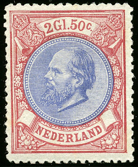 29, 2½ gulden rood en blauw, ongebruikt vrijwel prachtex. met volledige originele gom, waarin enkele oxidatiepuntjes. € 1400