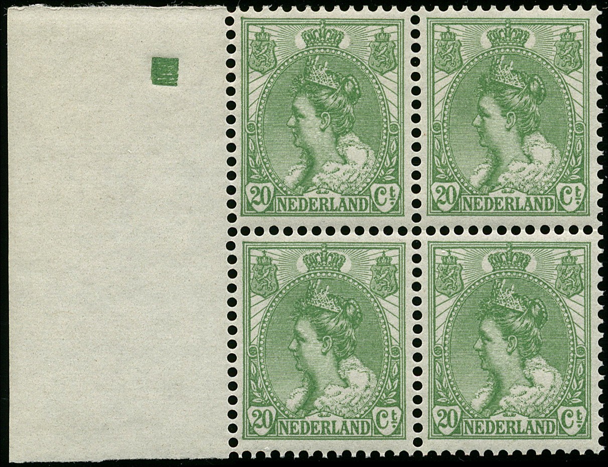 68, 20 cent groen, in luxe postfris blok van vier met linker velrand. € 6400