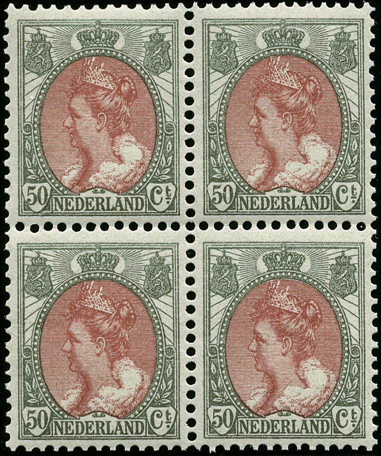 74, 50 cent bronsgroen en bruinrood, in luxe postfris blok van vier. € 2200