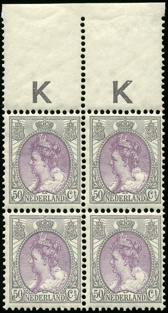 75, 50 cent grijs en violet in postfris prachtblok van vier met bovenvelrand. € 960