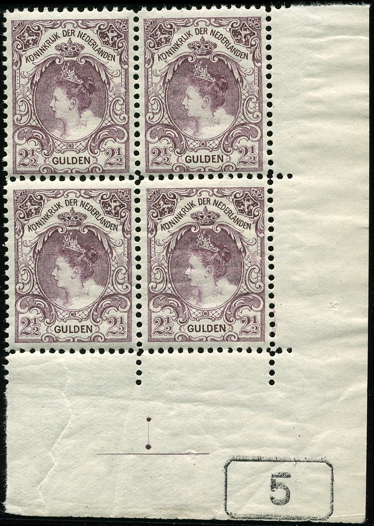 78C, 2½ gulden grijsviolet, Lt. 11 x 11½, in luxe postfris hoekrandblok van vier. € 1500