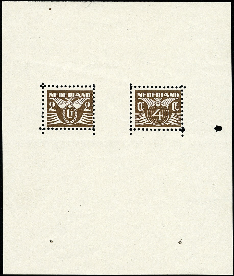 Lebeau 1924. Niet goedgekeurde ontwerpen voor de waarden 2 en 4 cent, tezamen op een crèmekleurig velletje van ca. 101 x 121 mm, getand, ongegomd, met knip, in bruin (Mi.11-0-6). Behoudens kleur als PC.207