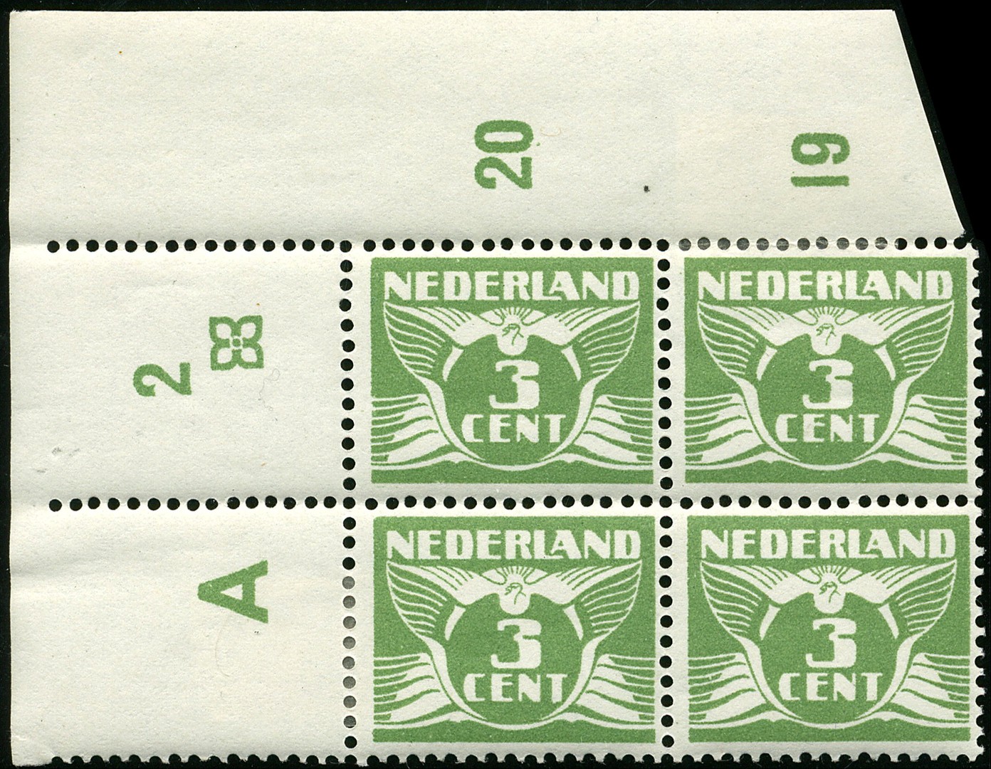 144/148, 1 t/m 4 cent vliegende duif zonder watermerk in postfrisse blokken van vier met randbedrukkingen. € 440