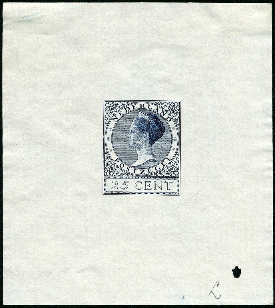 Veth. Stempelproef van de niet gekozen gravure van J.J. Warnaar van de 25 cent in groot formaat van ca. 23 x 28 mm met eenvoudige waarde-aanduiding zonder achtergrond, in zwartachtig blauw (Mi.31-0-8), in plaatdruk op ongegomd velletje van wit papier waarin knip. Niet gecatalogiseerd in beide proevencatalogi