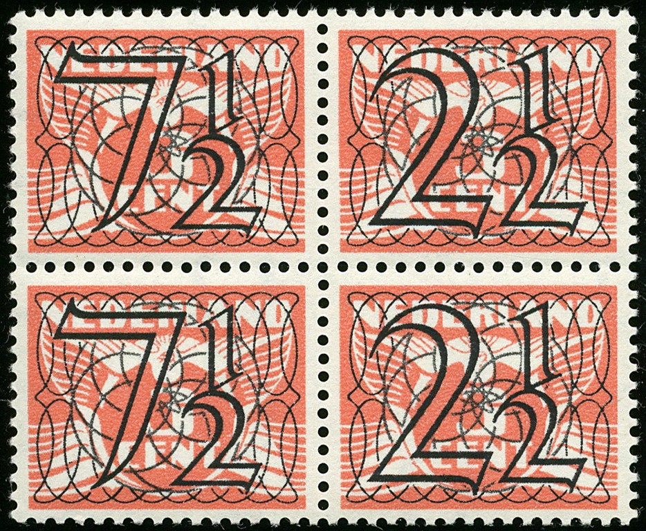 356e, combinatie 7½ en 2½ cent in blok van vier. Postfris prachtex. met cert. C.Muis (2000). € 350