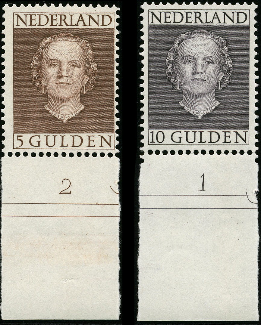 534/37, En Face 1 t/m 10 gulden, postfrisse pracht onderrandstukken met plaatnummers. € 1150