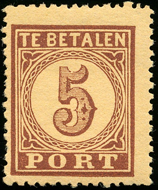 1AA, 5 cent bruin op oranje, postfris zeer fraai ex. (-1 tandje) met cert. Bakker (2002) € 850