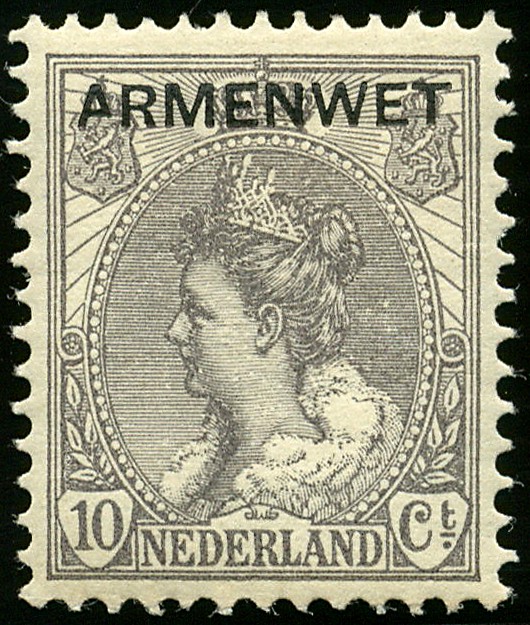 7f, 10 Cent Armenwet met opdrukafwijking 'Gebroken A', ongebruikt prachtex. € 340