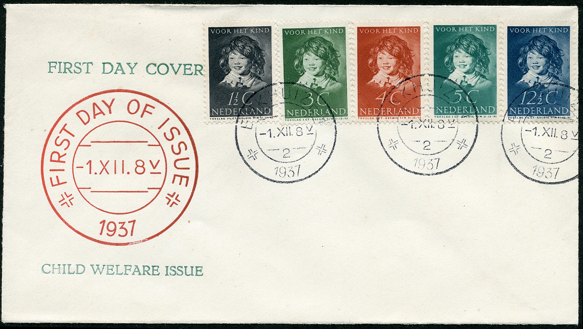 300/04, Kind 1937, op envelop uitgave S.J. Sluis, met eerste dag-afstempeling Enkhuizen 1-12-1937. Prachtenvelop, blanco met open klep en gom. S8, € 225