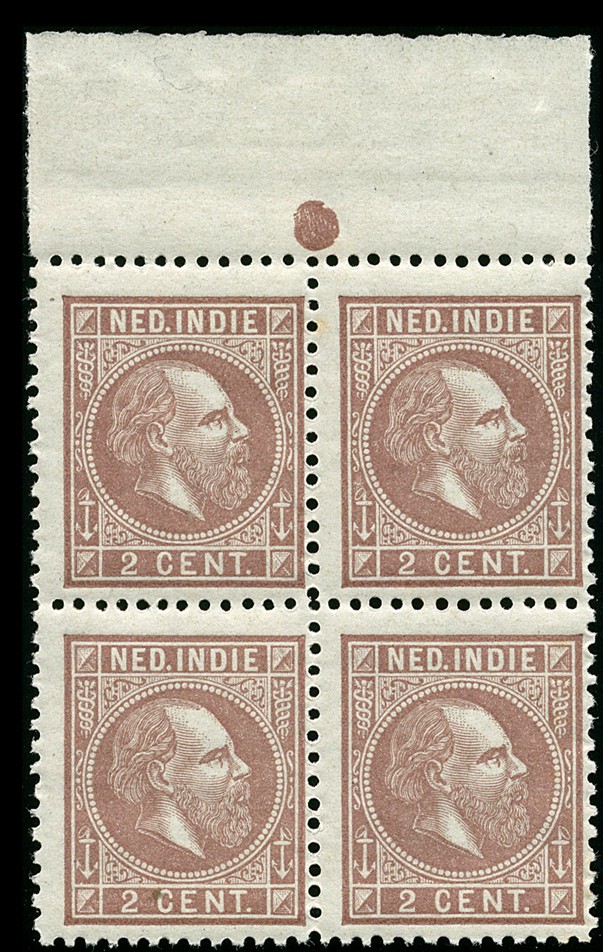 5F, 2 Cent lilabruin in kamtanding 12½ : 12 gr.g. in randblok van vier met volle, originele gom en postfris. 1 Ex. az. miniem bruin puntje, 1 ex. origineel zwart puntje in papier, overigens uitermate fris blok, prachtig van kleur en zeldzaam. € 2400