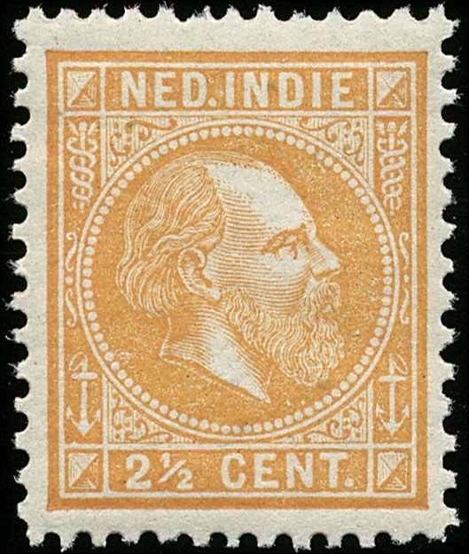 7F, 2½ Cent geel in kamtanding 12½ : 12 gr.g. Prachtex. met volle, originele gom en postfris (gom met paar authentieke zwarte puntjes erin). € 300