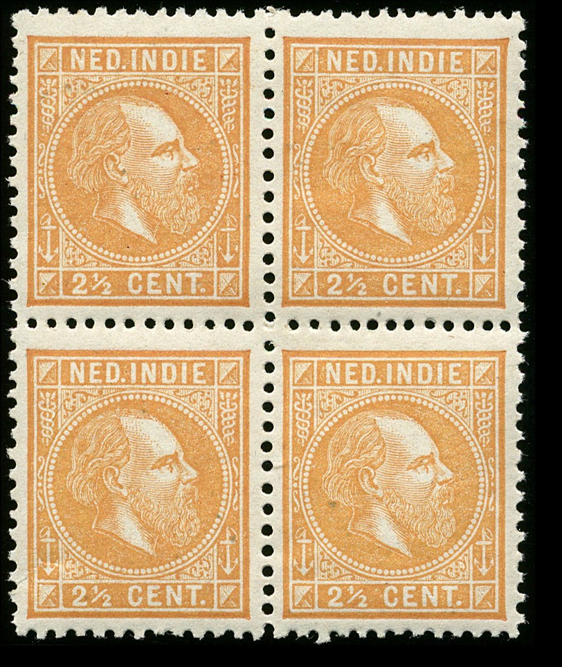 7F, 2½ Cent geel in kamtanding 12½ : 12 gr.g. Blok van vier met volle, originele gom en postfris (gom met paar authentieke zwarte puntjes erin), waarvan 3 prachtex. doch zegel linksonder miniem tandscheurtje (niet meegeteld). € 900