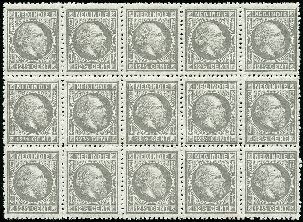 10H, 12½ Cent grijs in kamtanding 12½ kl.g. Blok van vijftien ex. met volle, originele gom en postfris (az. een paar onbeduidende bruine puntjes en gomvouw), zeer mooi van kleur. Zeldzaam in een dergelijke eenheid. € 600