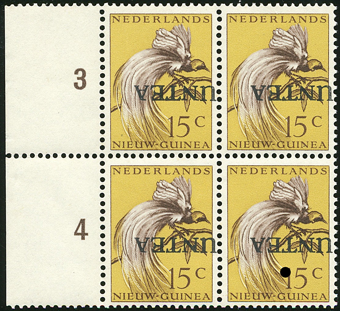 7f, 15 Cent met kopstaande opdruk, postfris randblok van vier. € 200