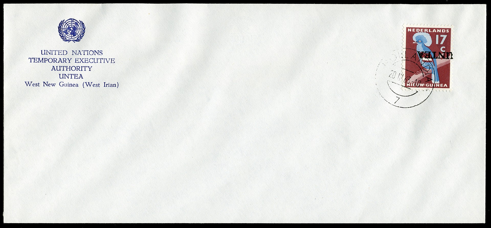 7f, 8f en 14f, 15 cent, 17 cent en 55 cent alle met kopstaande opdruk op 3 blanco UNTEA-enveloppen met verzoekafst. Hollandia 7 20-3-1963. € 250