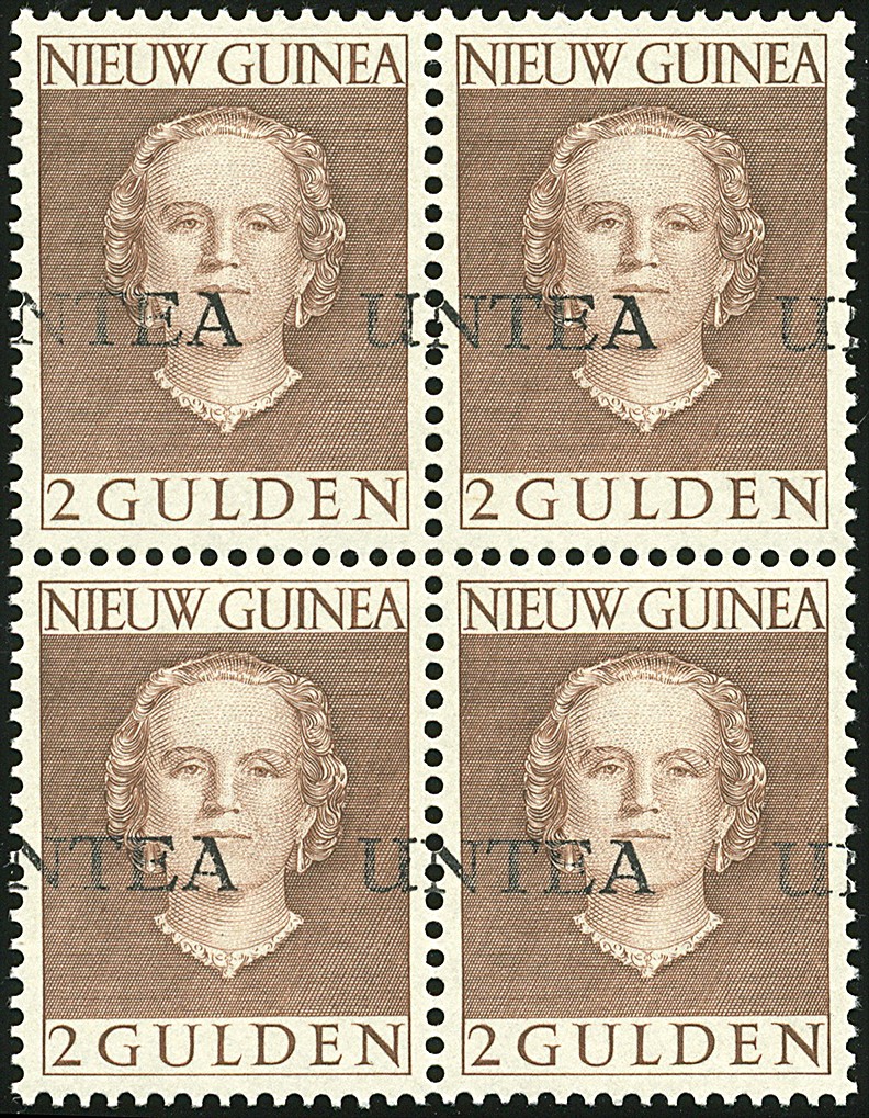 18, 2 Gulden met sterk verschoven opdruk, postfris blok van vier