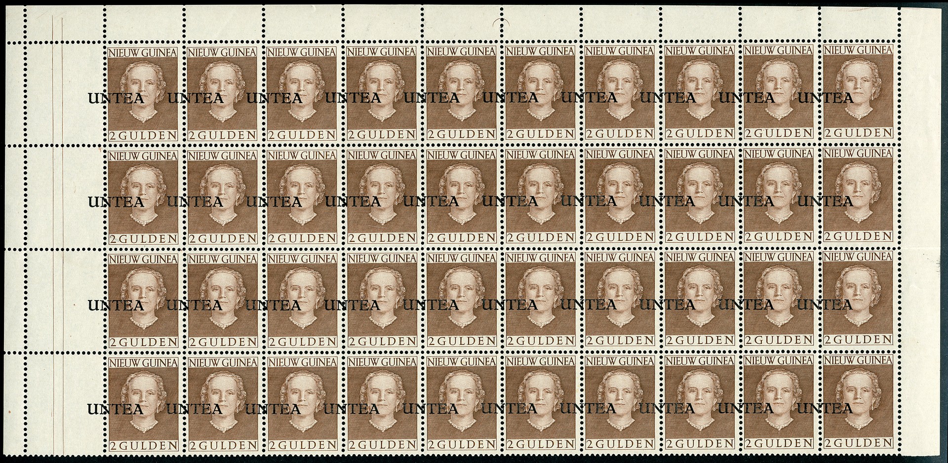 18, 2 Gulden met sterk verschoven opdruk naar links, postfris veldeel van 40 ex. met zij- en bovenvelranden. Spectaculair geheel!