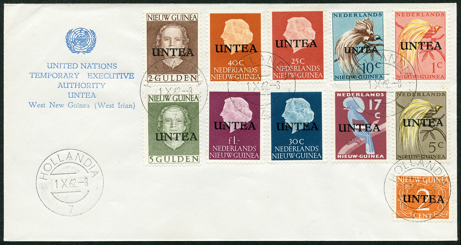 Twee FDC's (zonder adres, met open klep) van Hollandia 1-10-1962 waarop 11 resp. 8 verschillende zegels met UNTEA-opdruk w.o. 10 cent resp. 20 cent met kleine opdruk nrs. 42 en 46