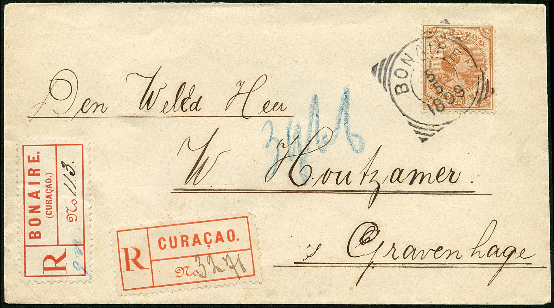 22, 25 cent oranjebruin op mooie frisse brief van BONAIRE 5/5/1899 via Curaçao naar 's-Gravenhage met 2 aantekenstrookjes. Aangetekende stukken uit Bonaire zijn zeldzaam, zeker in deze kwaliteit!