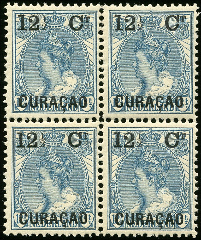 26/28, Opdrukserie Curaçao 12½ ct., 25 ct., en 1,50 gld in postfrisse prachtblokken van vier. € 1100