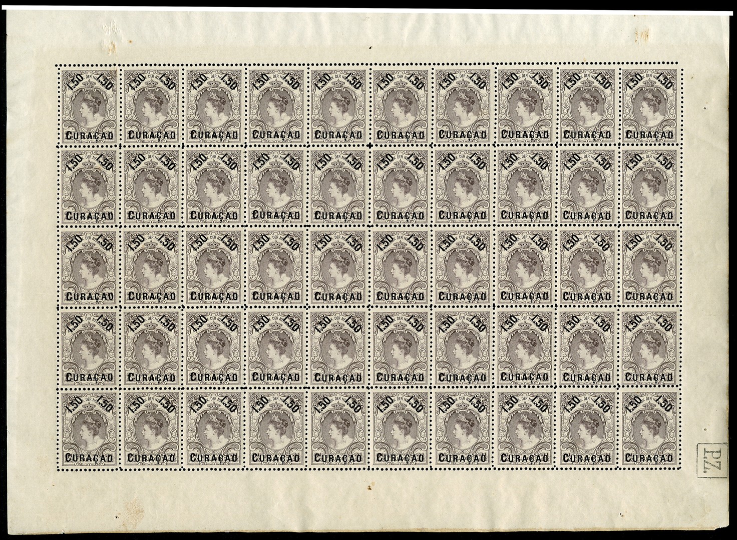 28, 1,50 op 2½ gulden in compleet postfris vel van 50 stuks (onderzijde iets los en 2 zegels met bruin puntje). € 5750