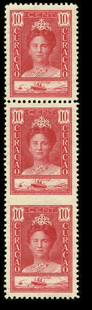 91v, 10 cent rood in verticaal paar (+ extra zegel) met variëteit: tussen de zegels ongeperforeerd. Postfris, licht getint prachtex. Cat.wrd. voor ongebruikt € 750