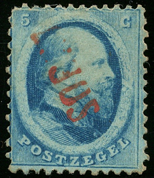 Naamstempel SOEST met schreefletters in rood op 5c nr. 4. Vr. prachtex. met complete afst.