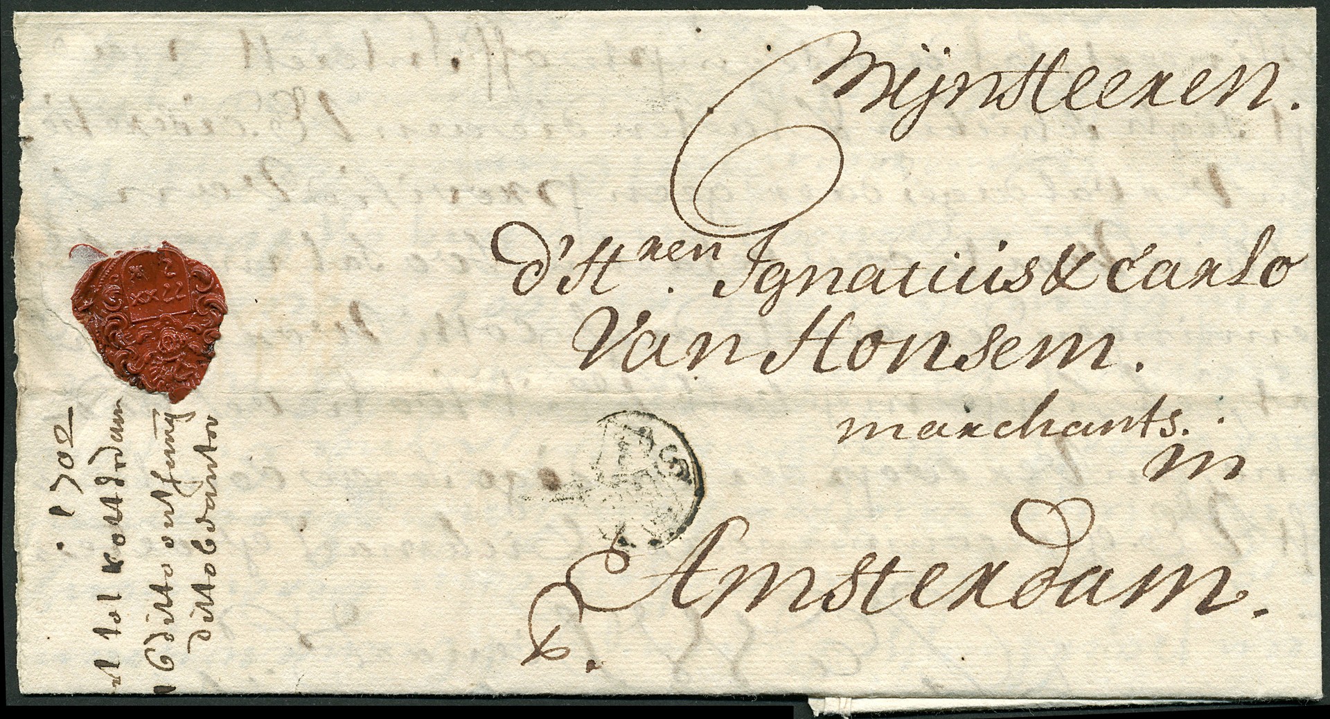 3-Stuiverstempels met de letter R op cpl. vouwbrieven van Rotterdam 15-4-1702 resp. 17-1-1709 naar Amsterdam