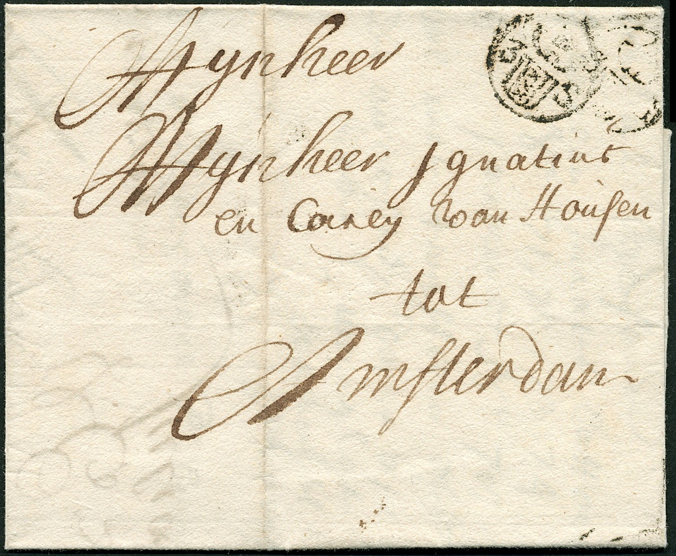 Schaars 3-stuiverstempel met 'D' te Amsterdam afgestempeld op vouwbrief uit Delft 3-12-1709. Uitgebreid cert. 'Van der Vlist, 2009'