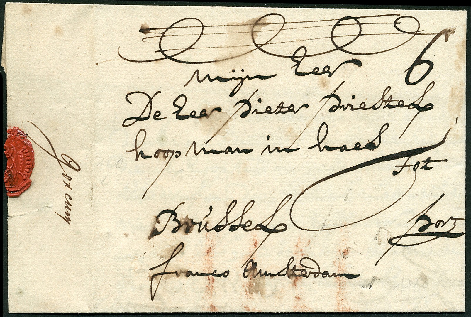 Vouwbrief van Alkmaar 3-12-1730 via de wisselplaats 'Gorcum' (az. geschreven, daar werden de postzakken gewisseld) naar een koopman in kaas te Brussel, met op vz. geschreven 'franco Amsterdam'