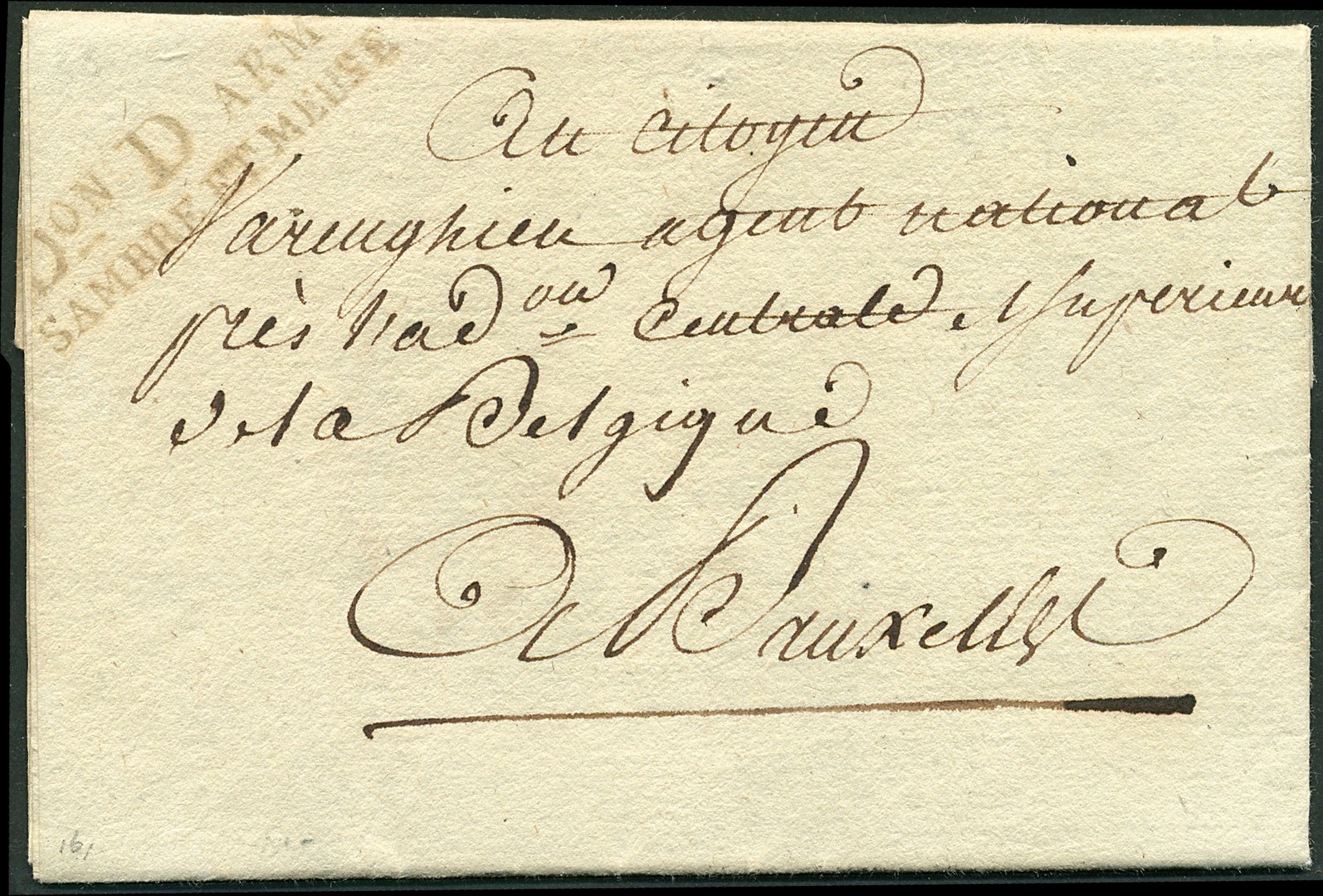 Militaria. Kwalitatief prachtige, deels gedrukte vouwbrief van het Armée de Sambre & Meuse te Maastricht op 15-6-1795 mogelijk per ordonnans naar Brussel, met mooie afdruk 'DON D ARM- / SAMBRE ET MEUSE' (Boom RR, € 1000)