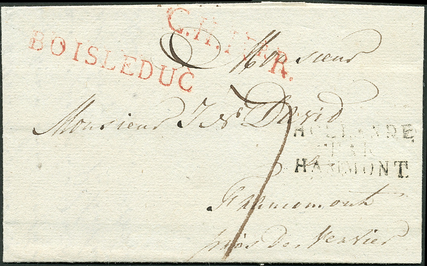 Noordelijke Nederlanden onder Frans bestuur. Prachtige vouwbrief van Den Bosch 21-3-1811 via Hammont (grenskantoorstempel in zwart) naar Francomont met in rood naam- en rayonstempel
