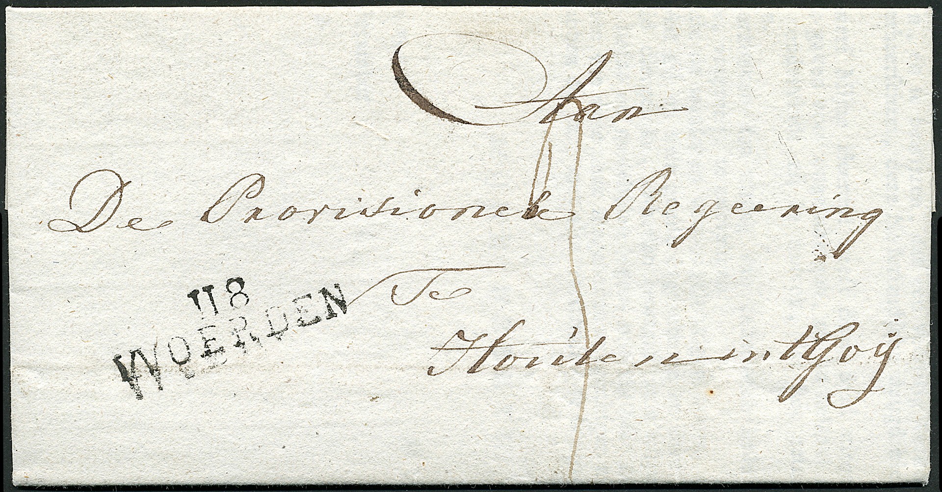 Gedrukte brief van De Commissie te Woerden, ter leniging van de Ramp aldaar' op 15-12-1813 gestuurd naar de Provinciale Regeering te Houten in 't Goy. Woerden werd op 24-11-1813 door terugtrekkende Franse troepen geplunderd. De tekst begint met 'De ontzettende treurmare der ongehoordste Moordtooneelen en Plunderingen, door een groot aantal Fransche gewapende Booswichten, den naam van Krijgslieden onwaardig,' enz. enz. Ondanks dit drama gebruikte Woerden toch het departementsstempel. Historisch document!