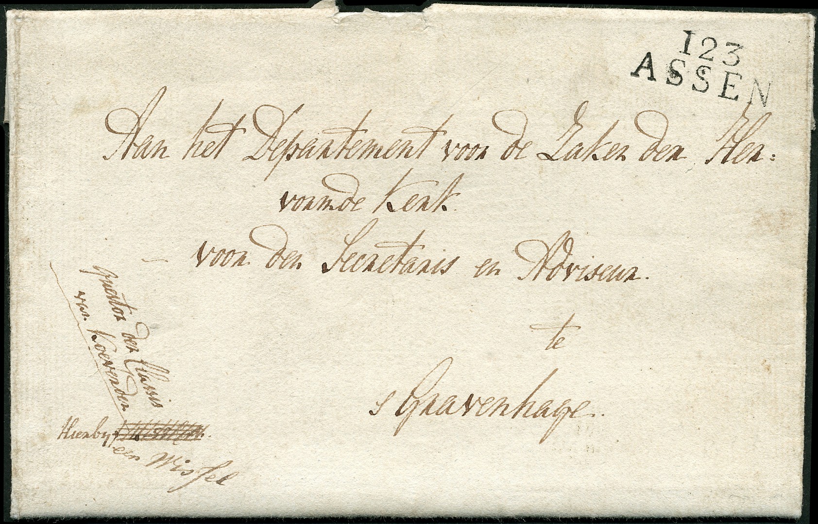 Cpl. vouwbrief geschr. te Oosterhesselen op 13-6-1818 van de 'Questor der Classis' van Koeverden (belast met de inning van collectegelden) met 'Hierbij een Wissel', via Assen naar 'sGravenhage, met luxe afdruk '123 / ASSEN'. Tevens briefje uit april 1825 met prachtafdruk naamstempel 'Delft'