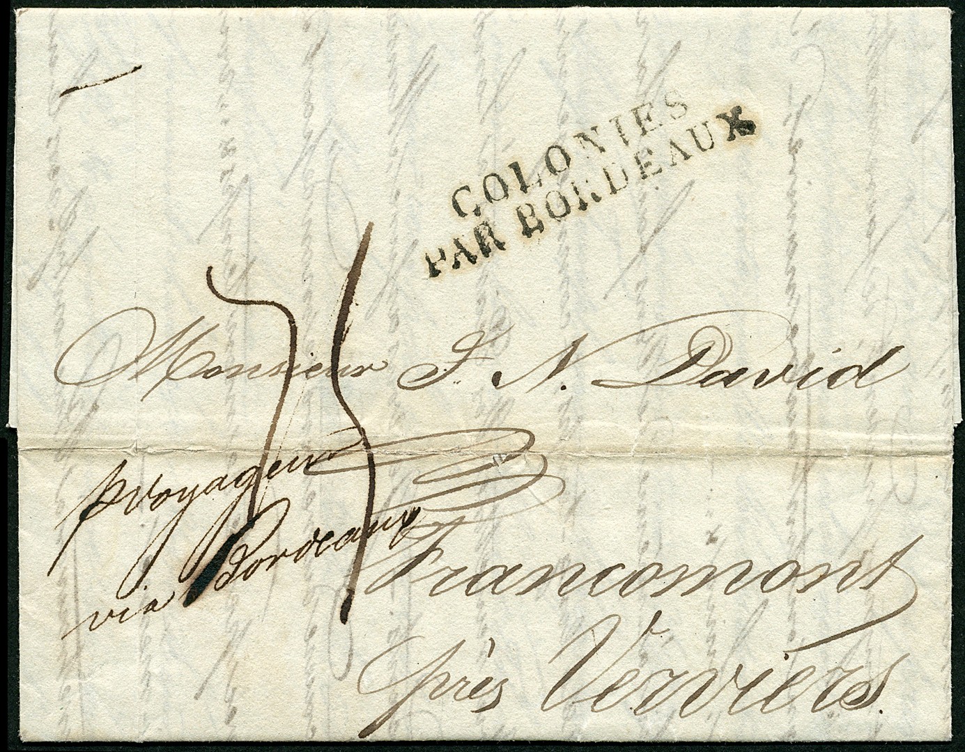 Zeer zeldzaam routestempel 'COLONIES / PAR BORDEAUX' (niet in VdL) op mooie vouwbrief van Valparaiso (Chili) 7-4-1827 via Bordeaux (zeldzame route) en Dinant (az. VdL.1527) naar Francomont