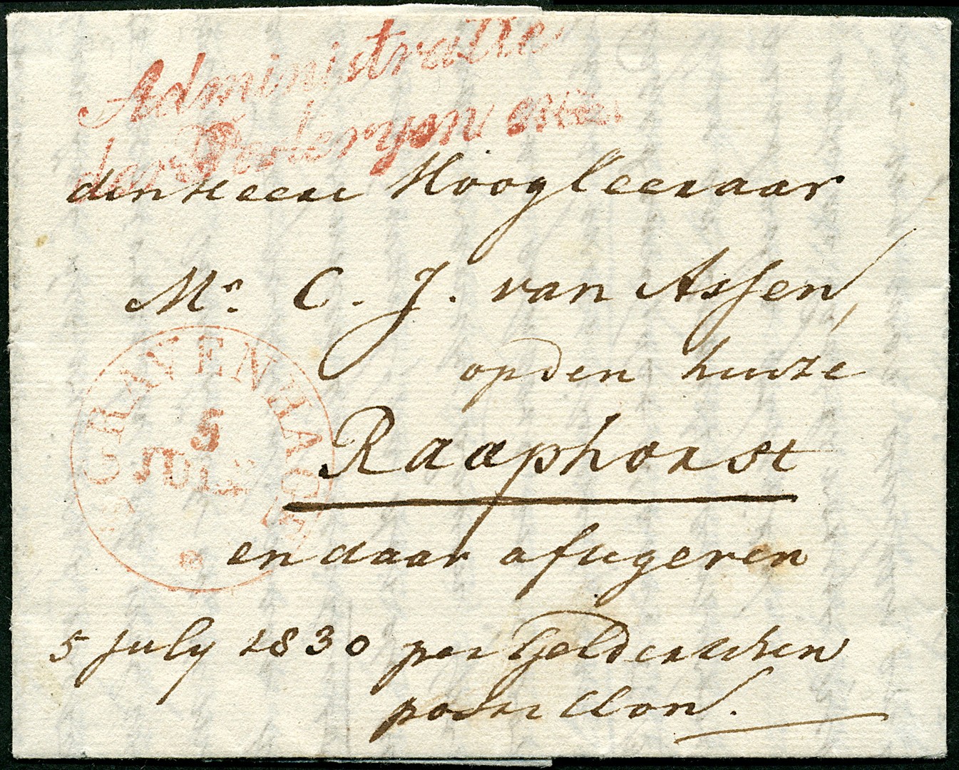 Koninklijke Nederlandsche Paardenposterij. Mooie vouwbrief van 'sGravenhage 5-7-1830 'per Gelderschen postillon' naar een hooggeleerde heer 'op den huize Raaphorst (in Wassenaar) en daar aftegeven', met linksboven in rood 'Administratie / der Posteryen enz.' (betreft portvrijdom posterijen)