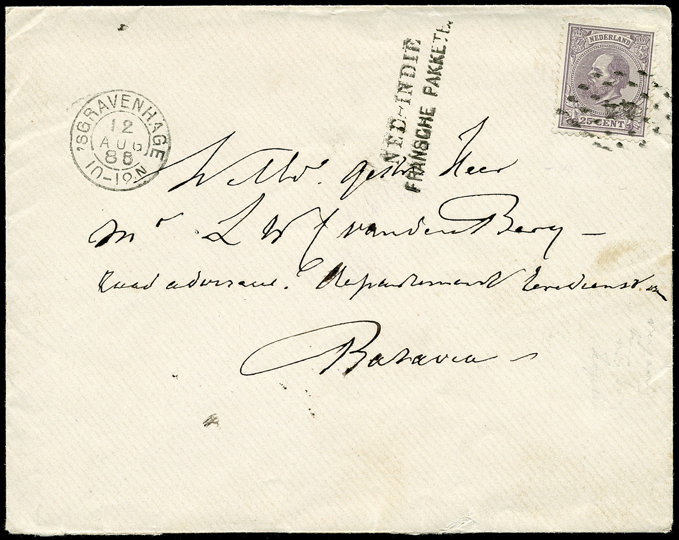 25 Cent nr. 26K op env. (az. iets ruw geopend) van 'sGravenhage 12-8-1886 met de Franse pakketboot via Weltevreden 12-9 naar Batavia en daar in de 'Voormidd' bezorgd