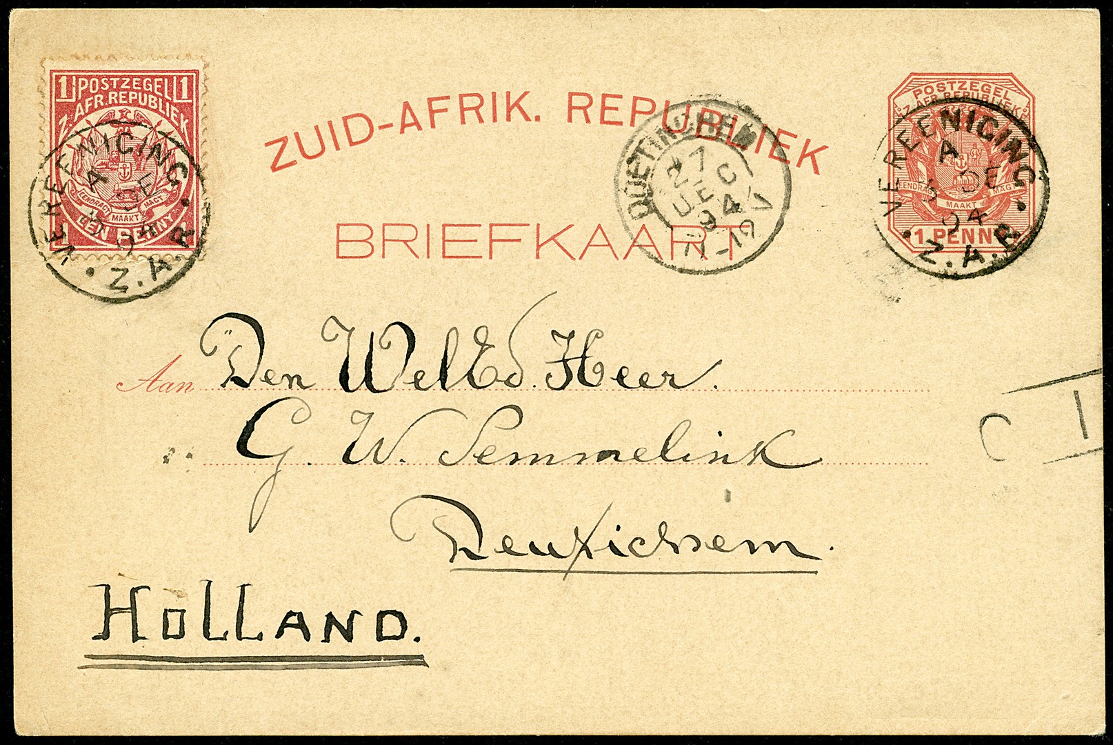 Incoming mail. Bk. van 1d uit de Zuid-Afrikaanse Republiek bijgefr. met 1d van Vereeniging 3-12-1894 naar Doetinchem 27-12, alsmede env. van 2½d van Sea Point C.G.H. 22-12-1897 (Kaap de Goede Hoop) naar Rotterdam 8-1-1898