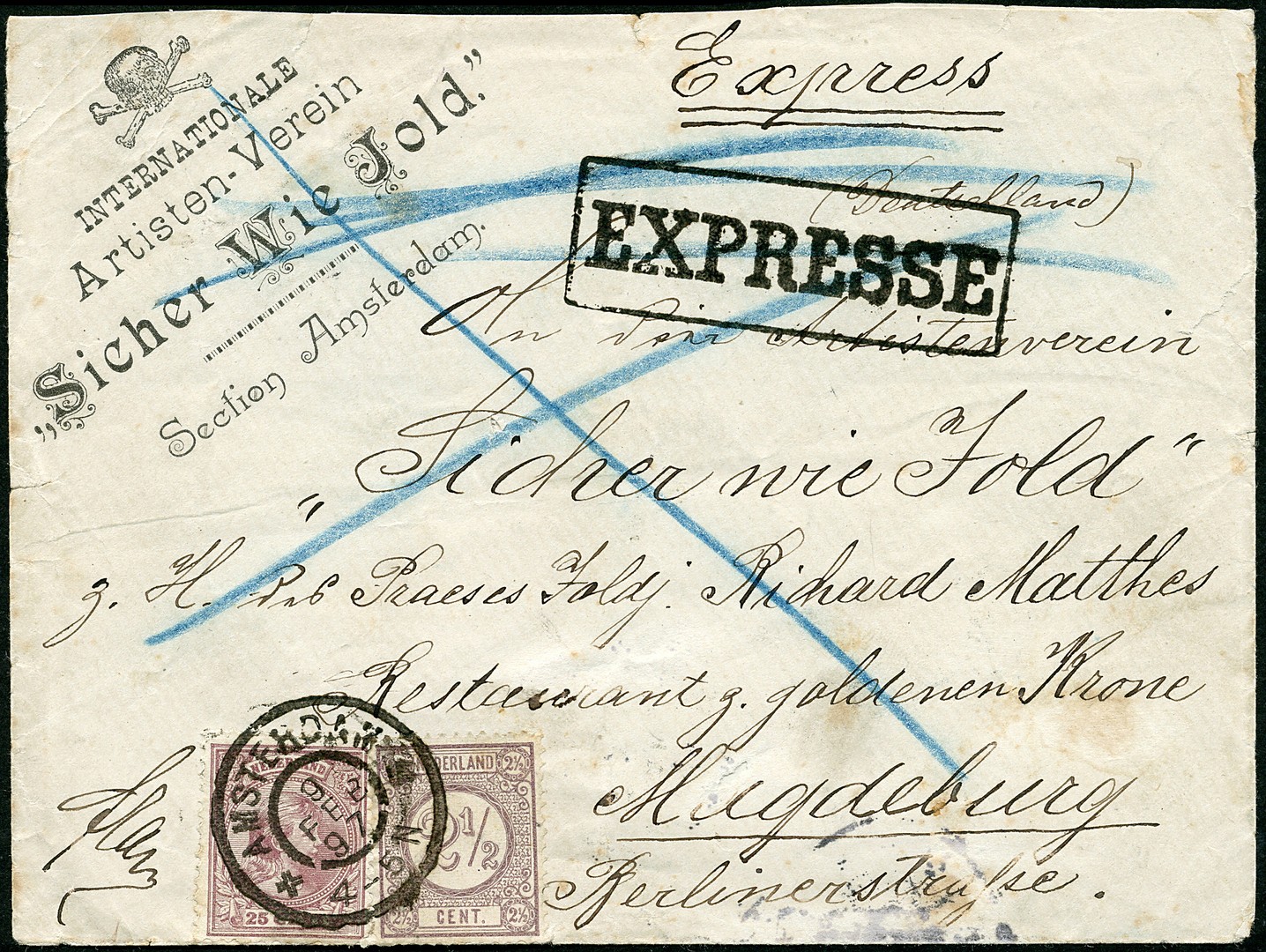 25 Cent Hangend Haar en 2½c (beide zeer fraai) op per expresse van Amsterdam 9-2-1897 naar Magdeburg 10-2 verzonden couvert van de Artiestenvereniging 'Sicher Wie Jold'