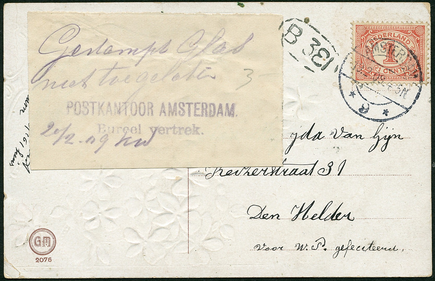 Prentbk. gefr. met 1c van Amsterdam 19-2-1909 met bestemming Den Helder doch door het postkantoor van Amsterdam, Bureel vertrek, voorzien van etiketje met geschreven mededeling 'Gestampt Glas niet toegelaten'. Door ons nog niet eerder gezien