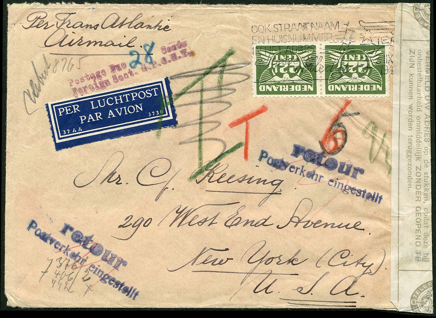 Env. gefr. met 22½c Lebeau in paar afgest. Hilversum 3 IIX (!) 1941 'Per Trans Atlantic Airmail' naar New York, diverse postale notities, gecensureerd te Keulen 4-12 (az. stempels en strook), tevens geopend en gesloten met strook 'Deze brief kon wegens onbestelbaarheid...teruggezonden.' alsmede 2x in blauw 'retour / Postverkehr eingestellt'. Uiteindelijk in New York alwaar 'Postage Due 28 Cents / Foreign Sect. G.P.O.N.Y.'
