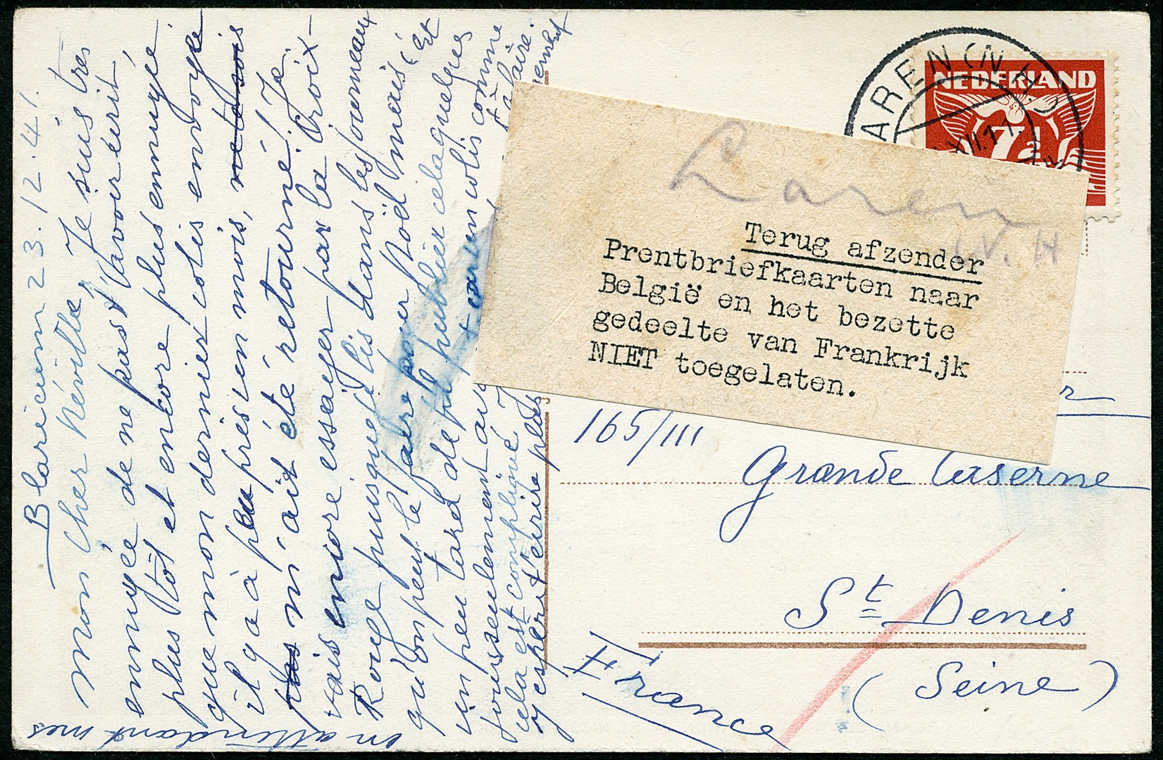 Prentbk. gefr. met 7½c van Laren (N.H.) 24-12-1941 met bestemming Frankrijk, doch voorzien van etiket 'Terug afzender / Prentbriefkaarten naar / België en het bezette / gedeelte van Frankrijk / NIET toegelaten.'