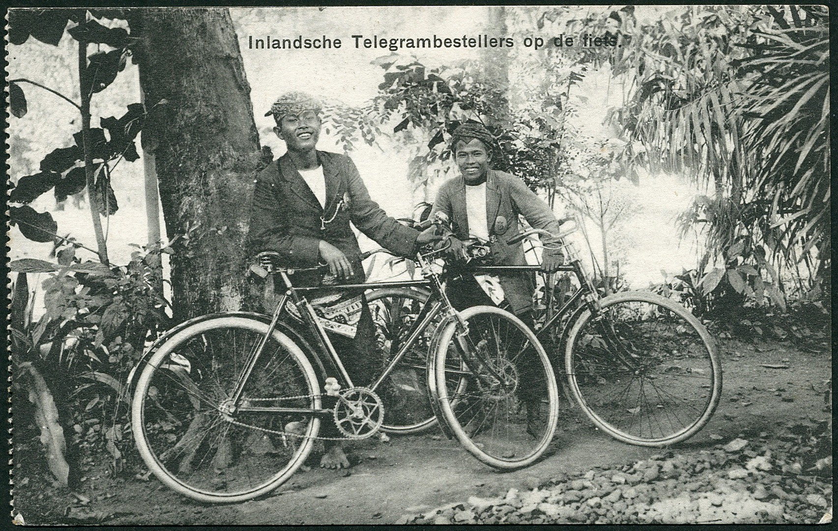 Prentbriefkaart van 'Inlandsche Telegrambestellers op de fiets', van Semarang 18-11-1919 naar Terneuzen