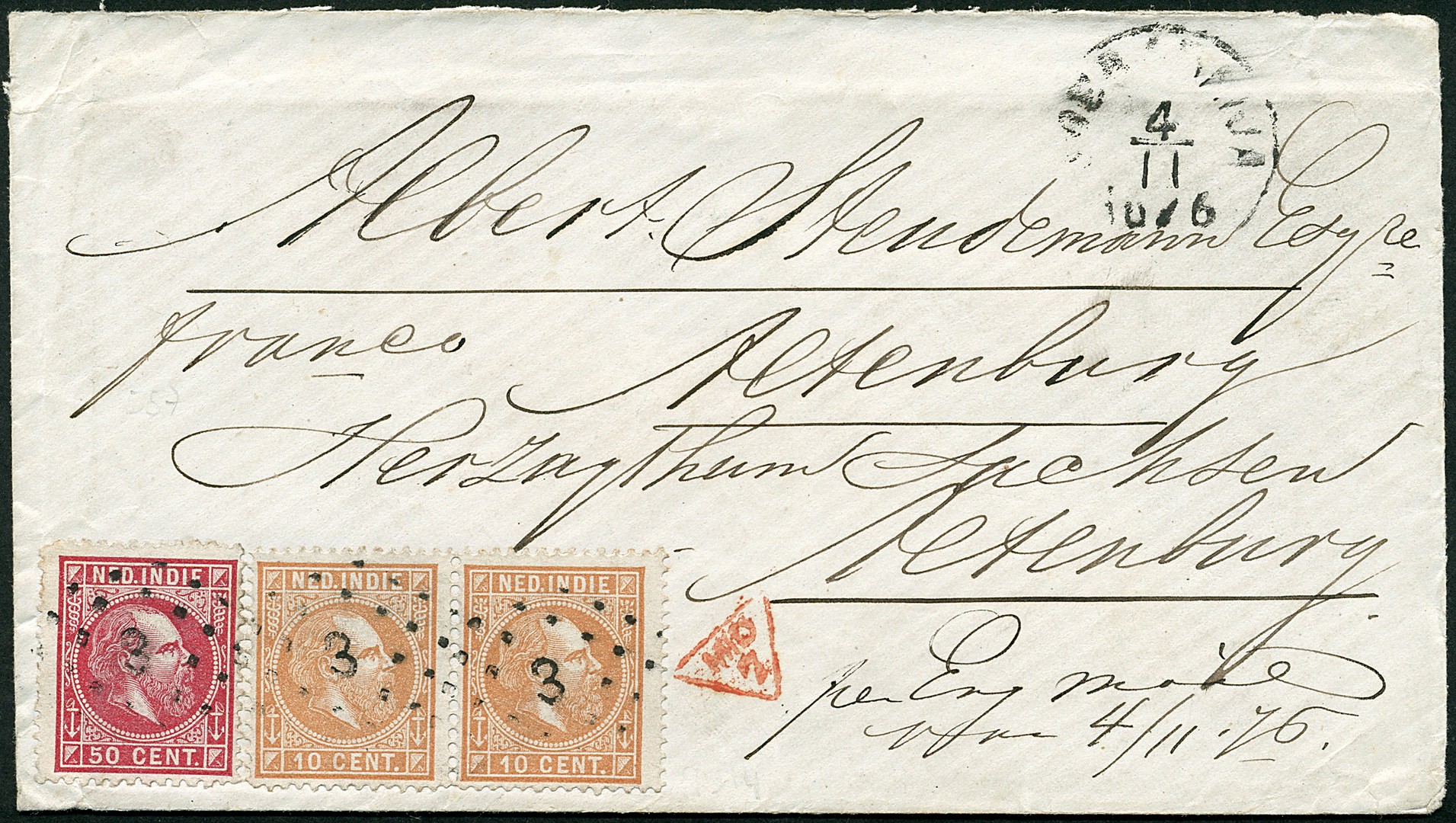 DUITSLAND. 10 Cent nr. 9D in paar en 50c nr. 15C op env. van Soerabaija 4-11-1876 (voor toetreding tot de UPU) 'per Eng. mail' naar Altenburg (Saksen) 18-12. Tarief 70 cent (zie NITAR 81), vz. rood stempeltje 'MID / 7'