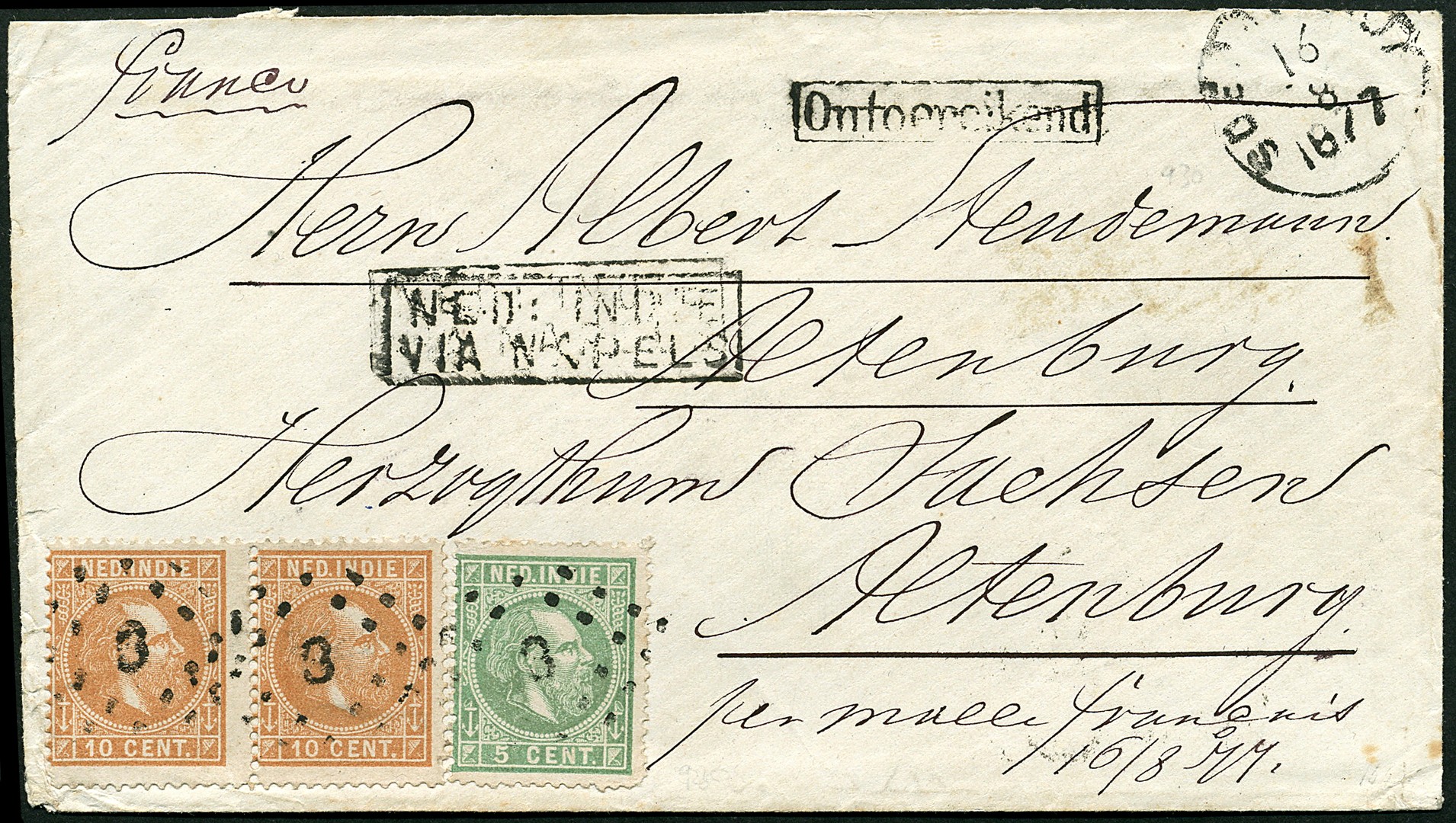 DUITSLAND. 10 Cent nr. 9D in paar en 5c nr. 8C op env. van Soerabaija 16-8-1877 (na toetreding tot de UPU) via Napels 22-9 naar Altenburg (Saksen) 26-9. Tarief is juist, stempel 'Ontoereikend' moet per abuis zijn afgedrukt